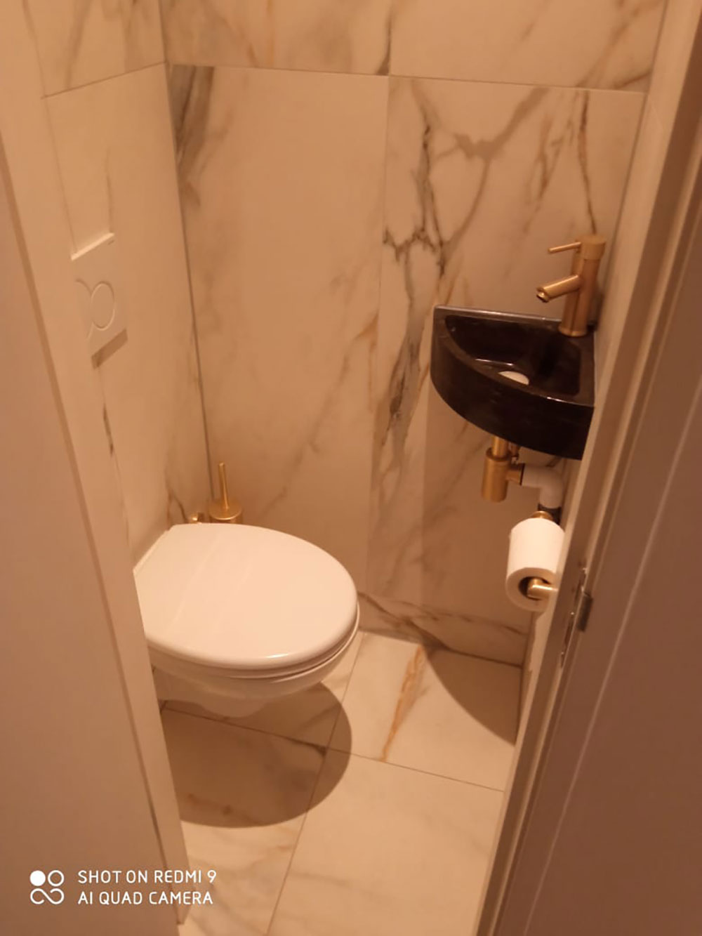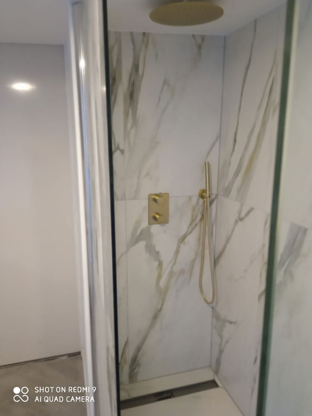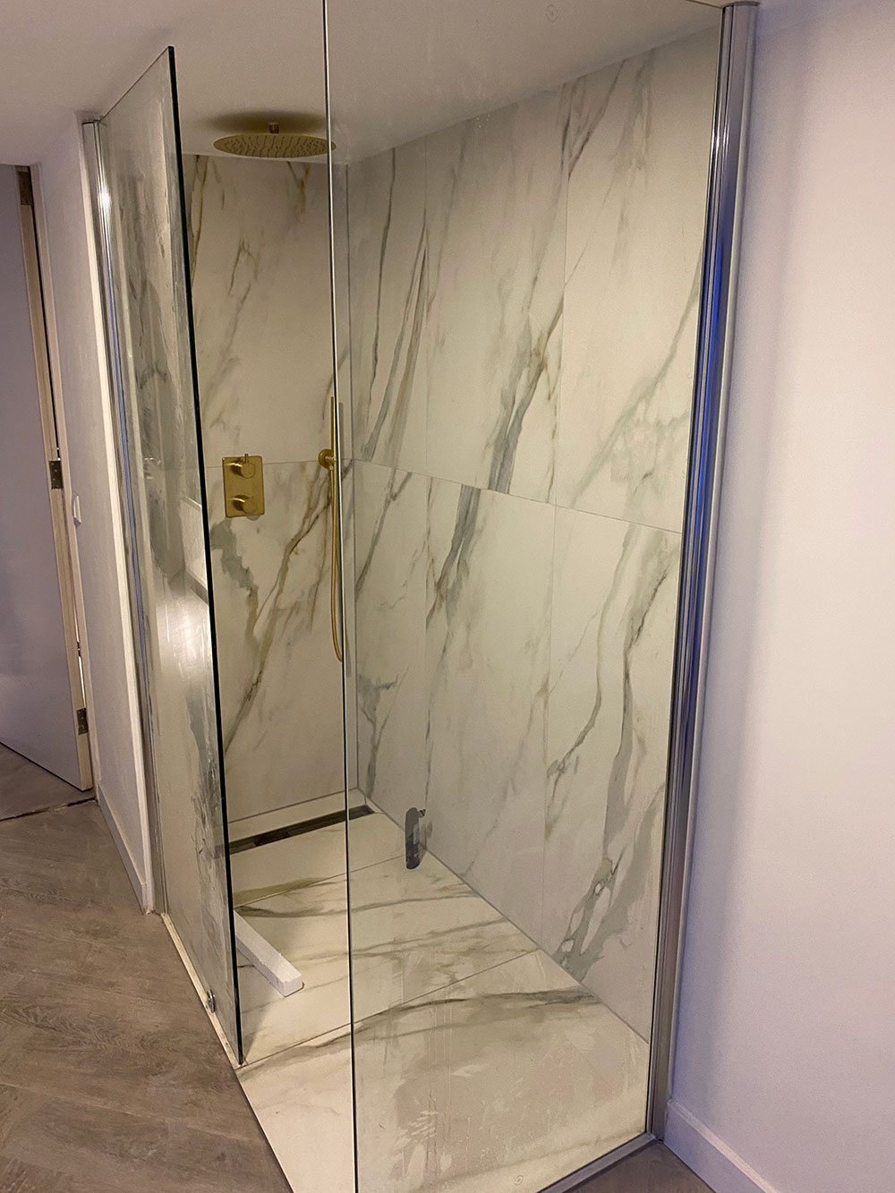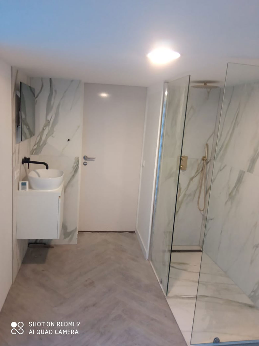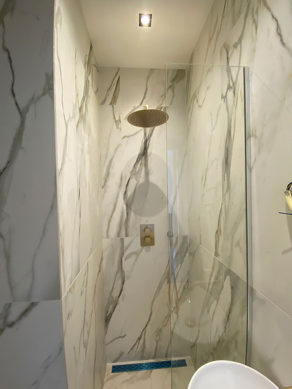 De luxe uitgevoerde badkamer heeft een regendouche met gouden kranen. Alle wanden en vloer zijn met prachtig marmer afgewerkt (calagotta gold). Er is een infrarood spiegel met thermostaat zodat je zelf de temperatuur kunt regelen.