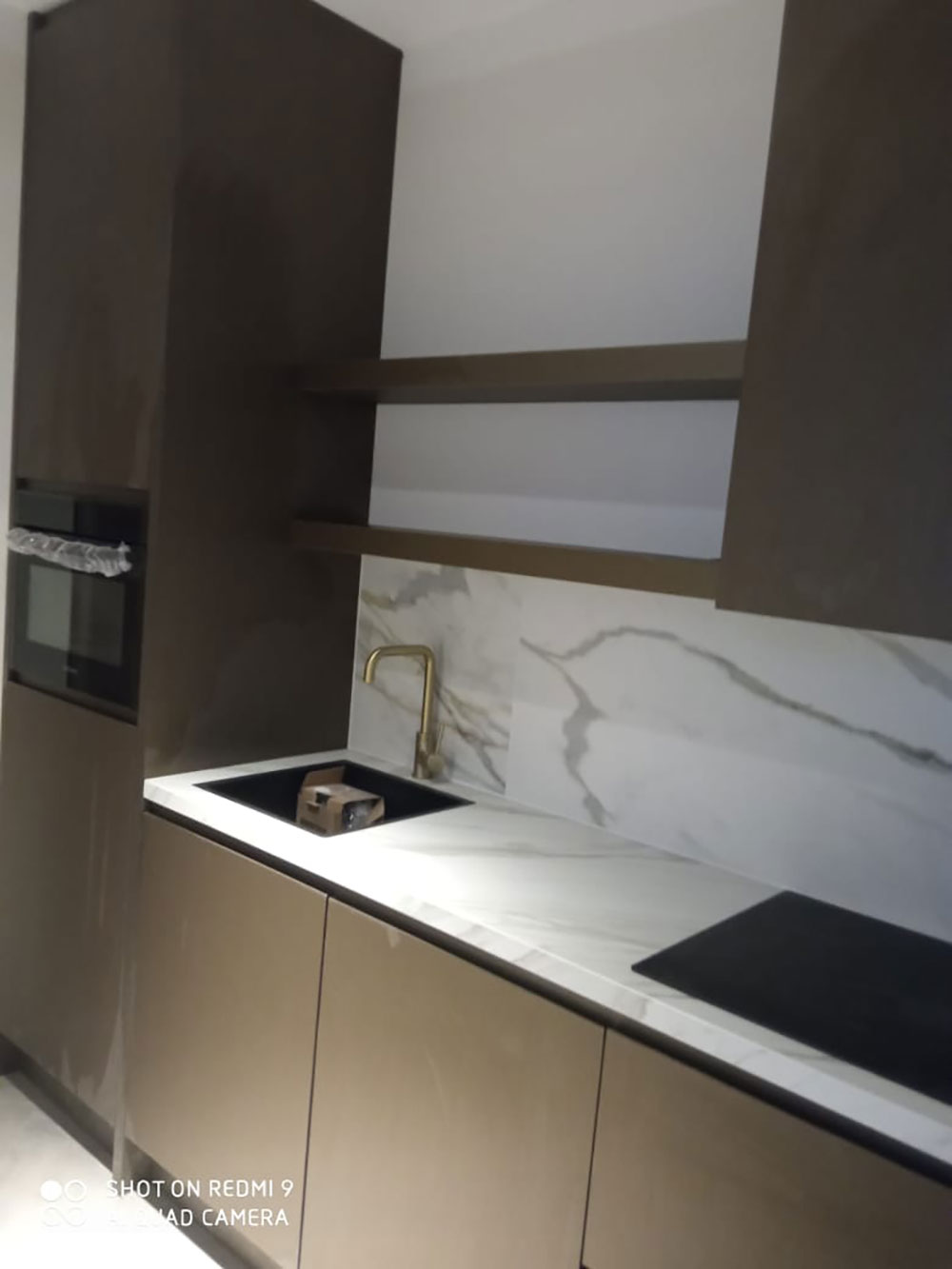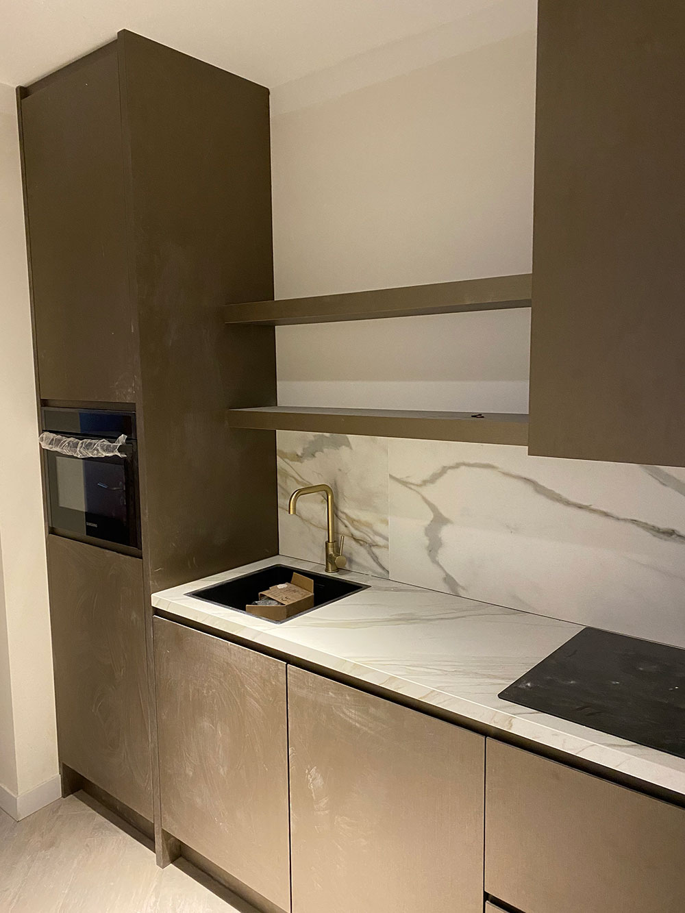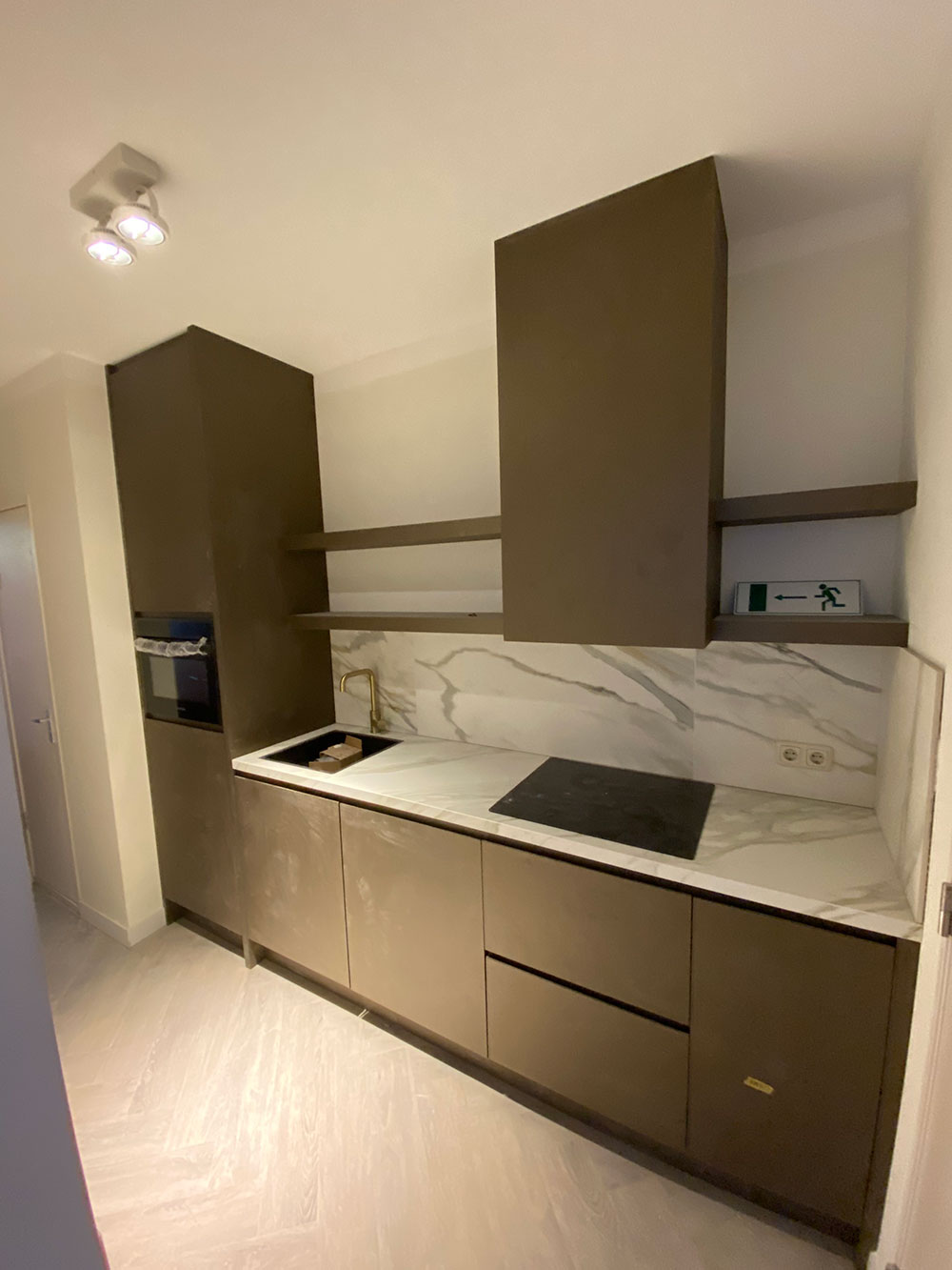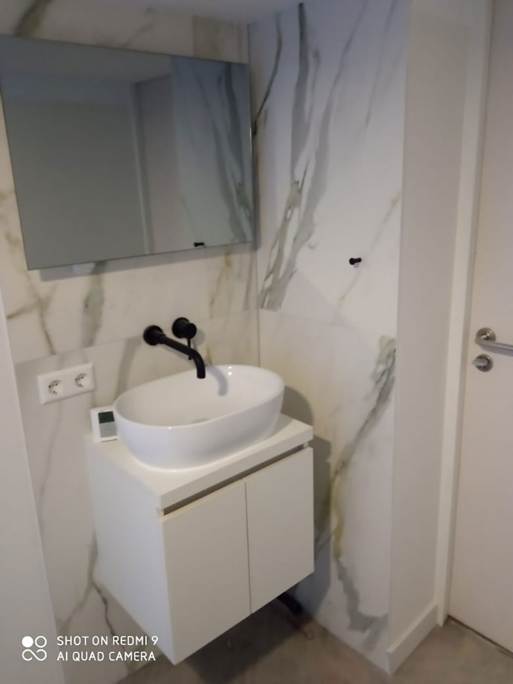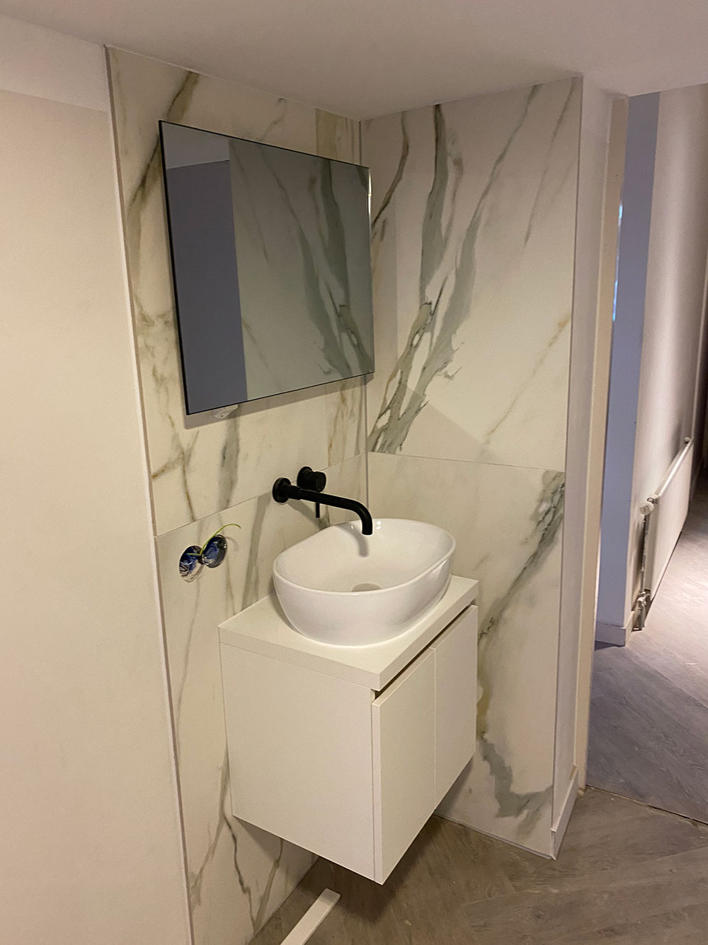 De luxe uitgevoerde badkamer heeft een regendouche met gouden kranen. Alle wanden en vloer zijn met prachtig marmer afgewerkt (calagotta gold). Er is een infrarood spiegel met thermostaat zodat je zelf de temperatuur kunt regelen.