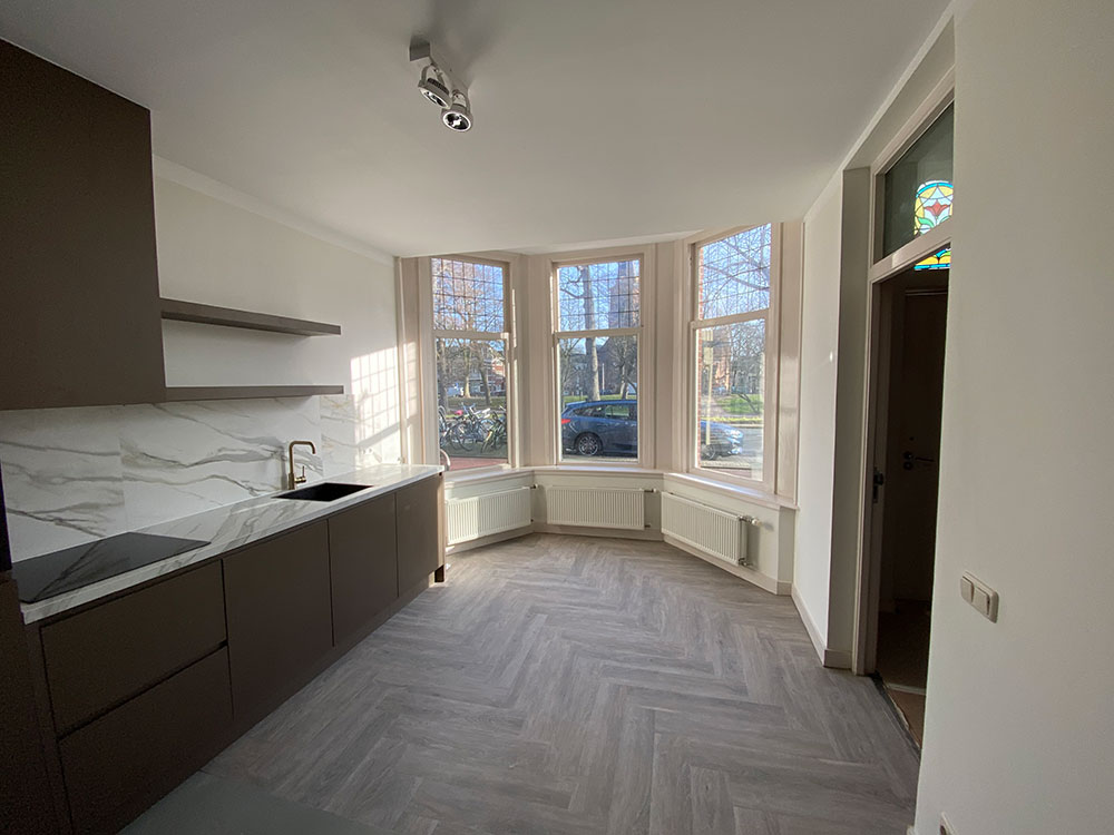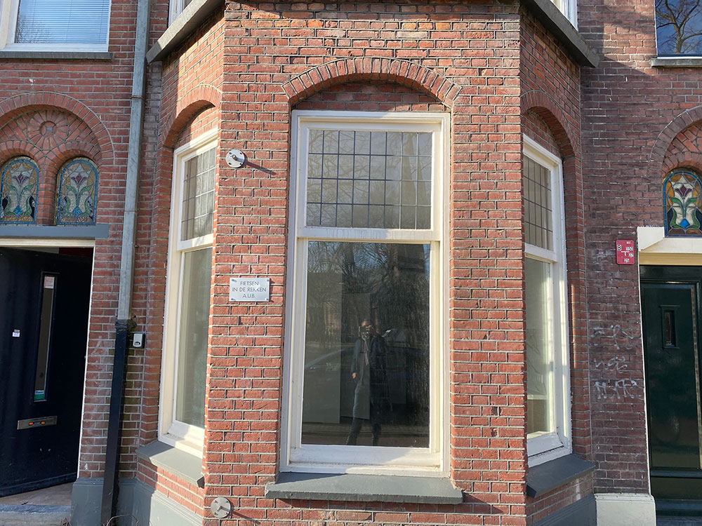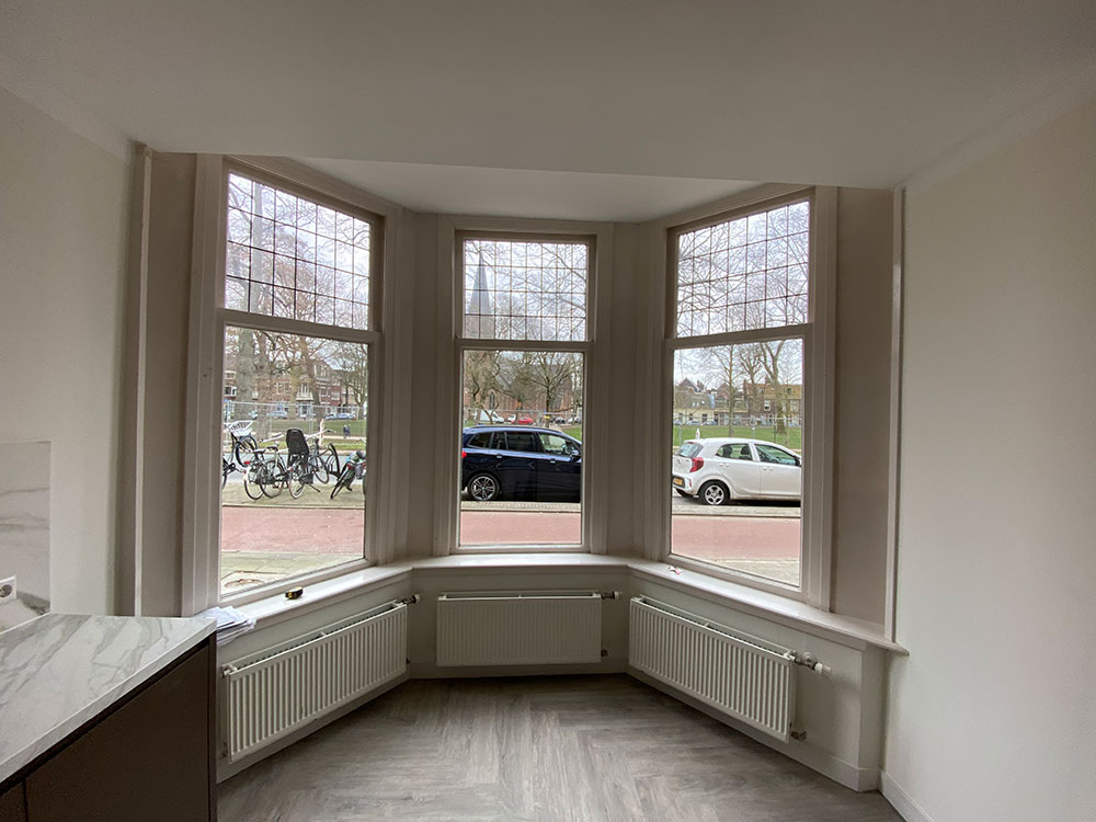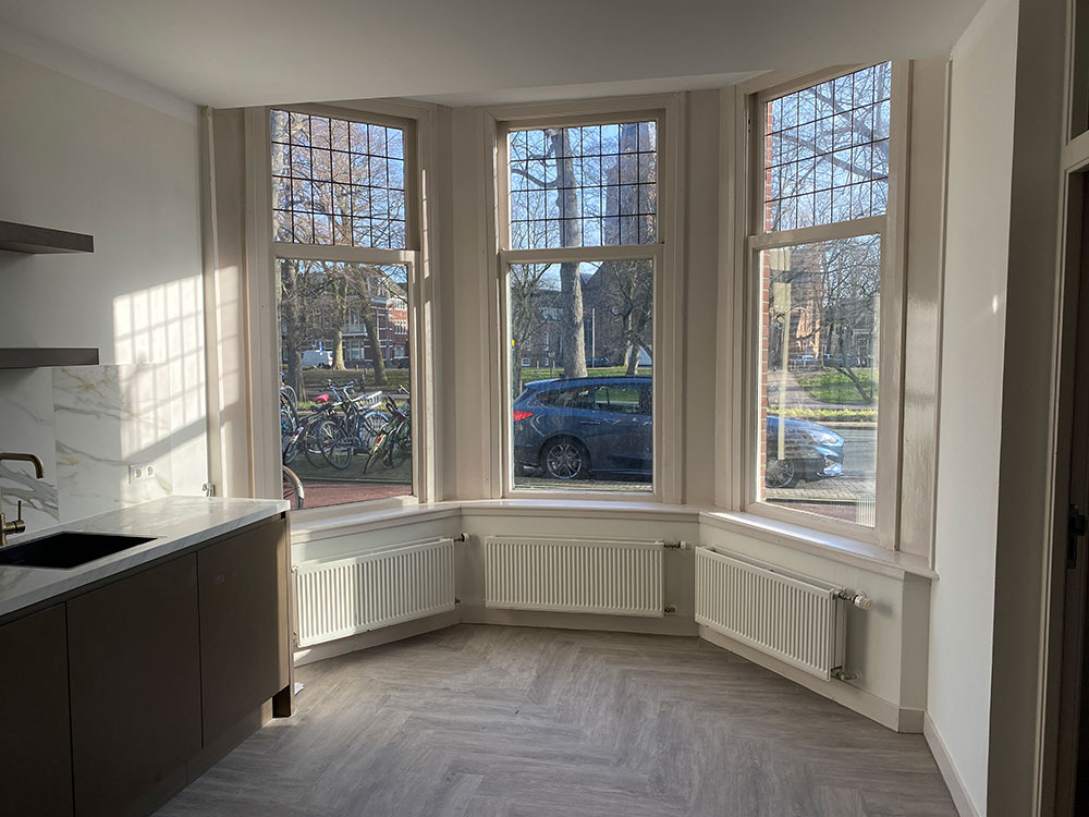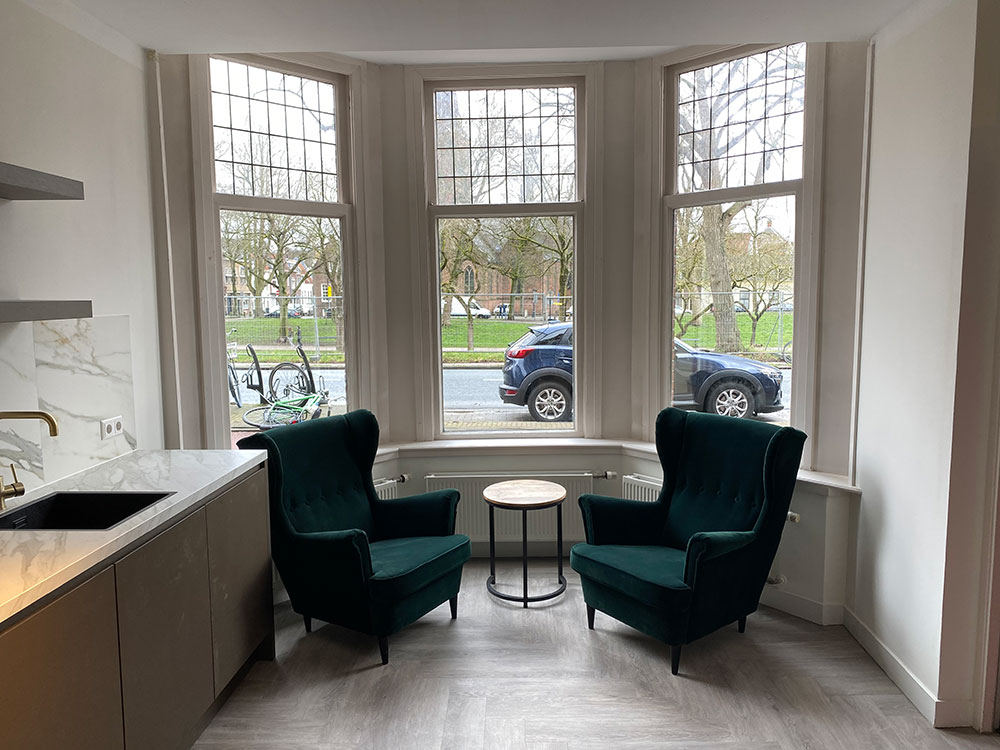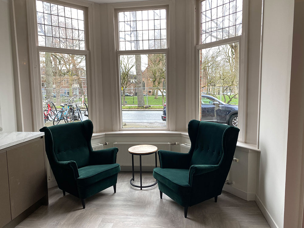 Aan de voorzijde bevindt zich een erker met 4 grote originele ramen met uitzicht op de singels en het park. Er staan 2 lekkere fauteuils.
