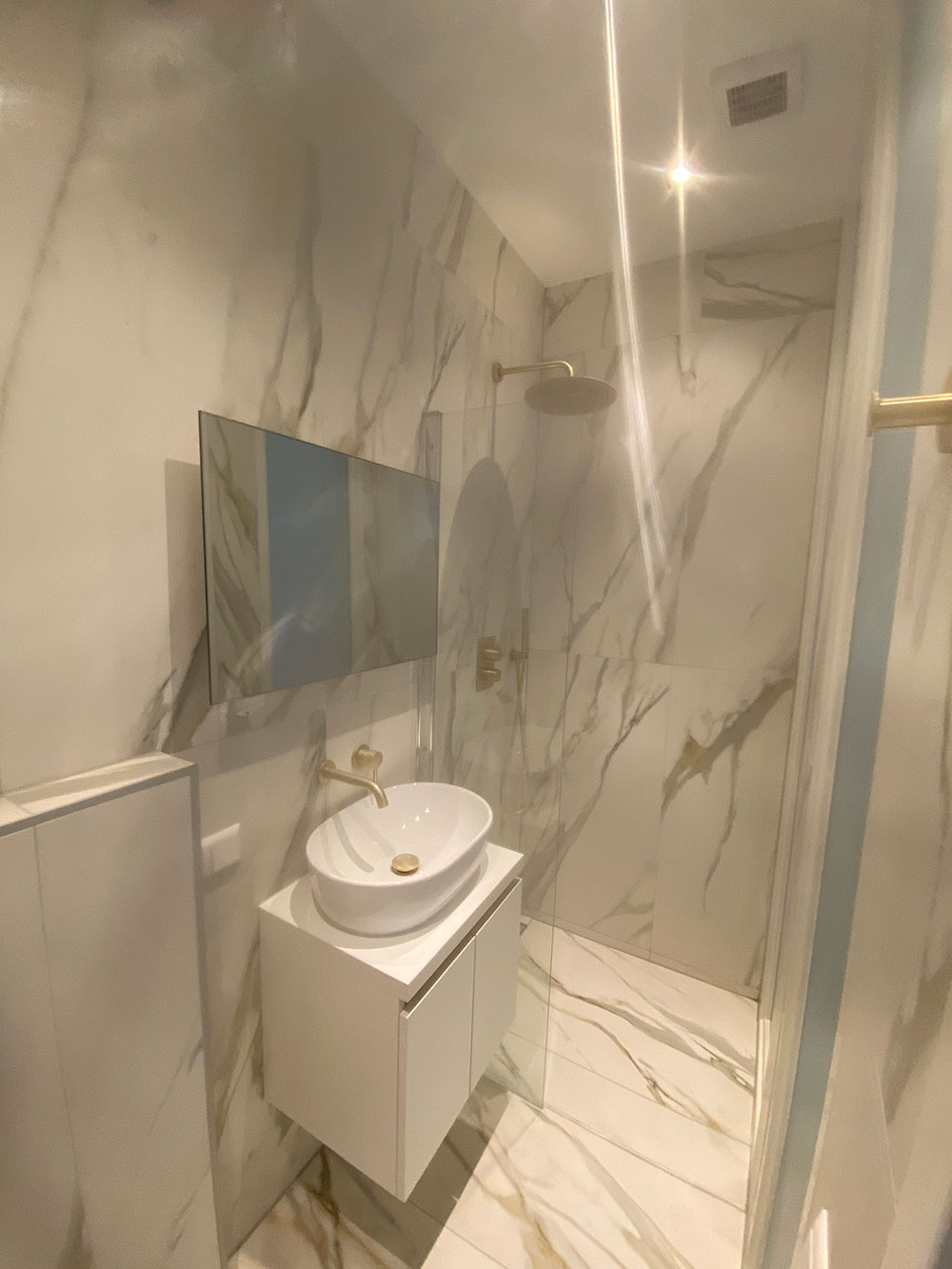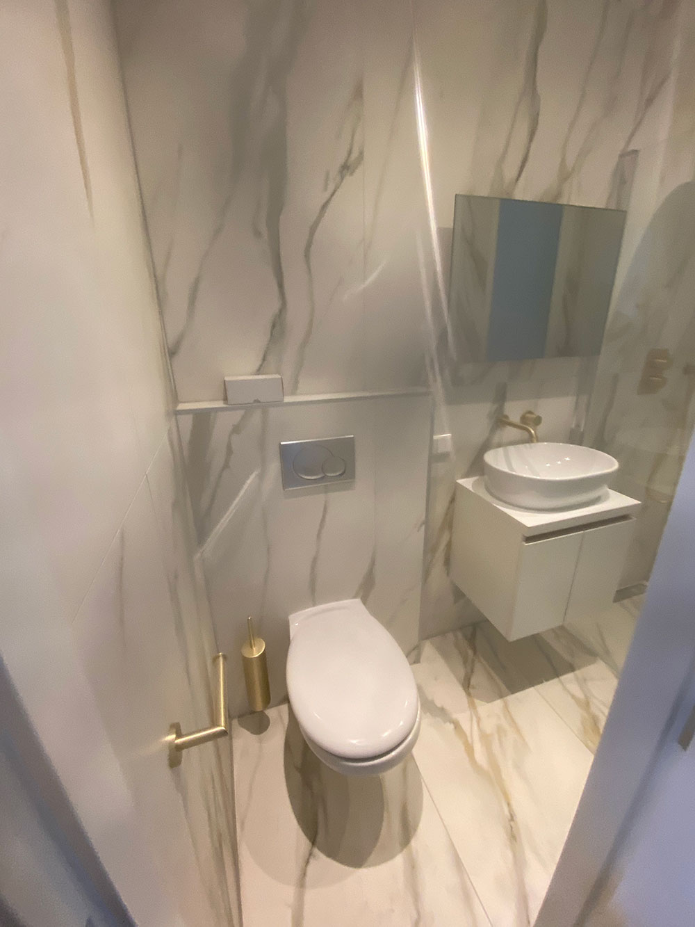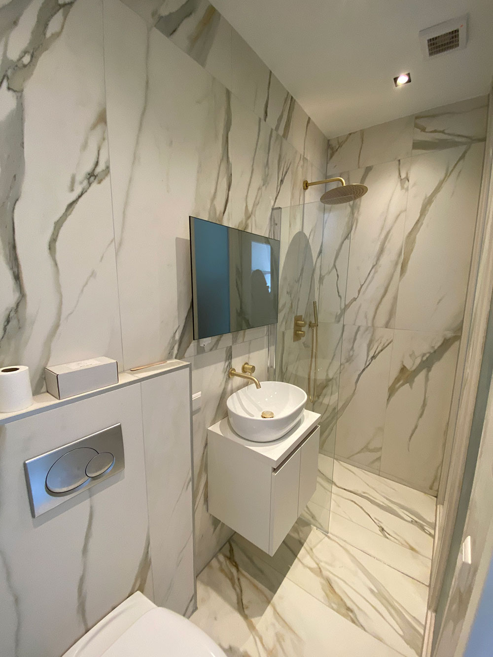 De luxe uitgevoerde badkamer heeft een regendouche met gouden kranen. Alle wanden en vloer zijn met prachtig marmer afgewerkt (calagotta gold). Er is een infrarood spiegel met thermostaat zodat je zelf de temperatuur kunt regelen.