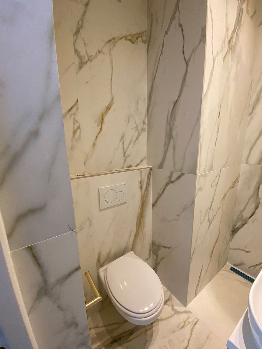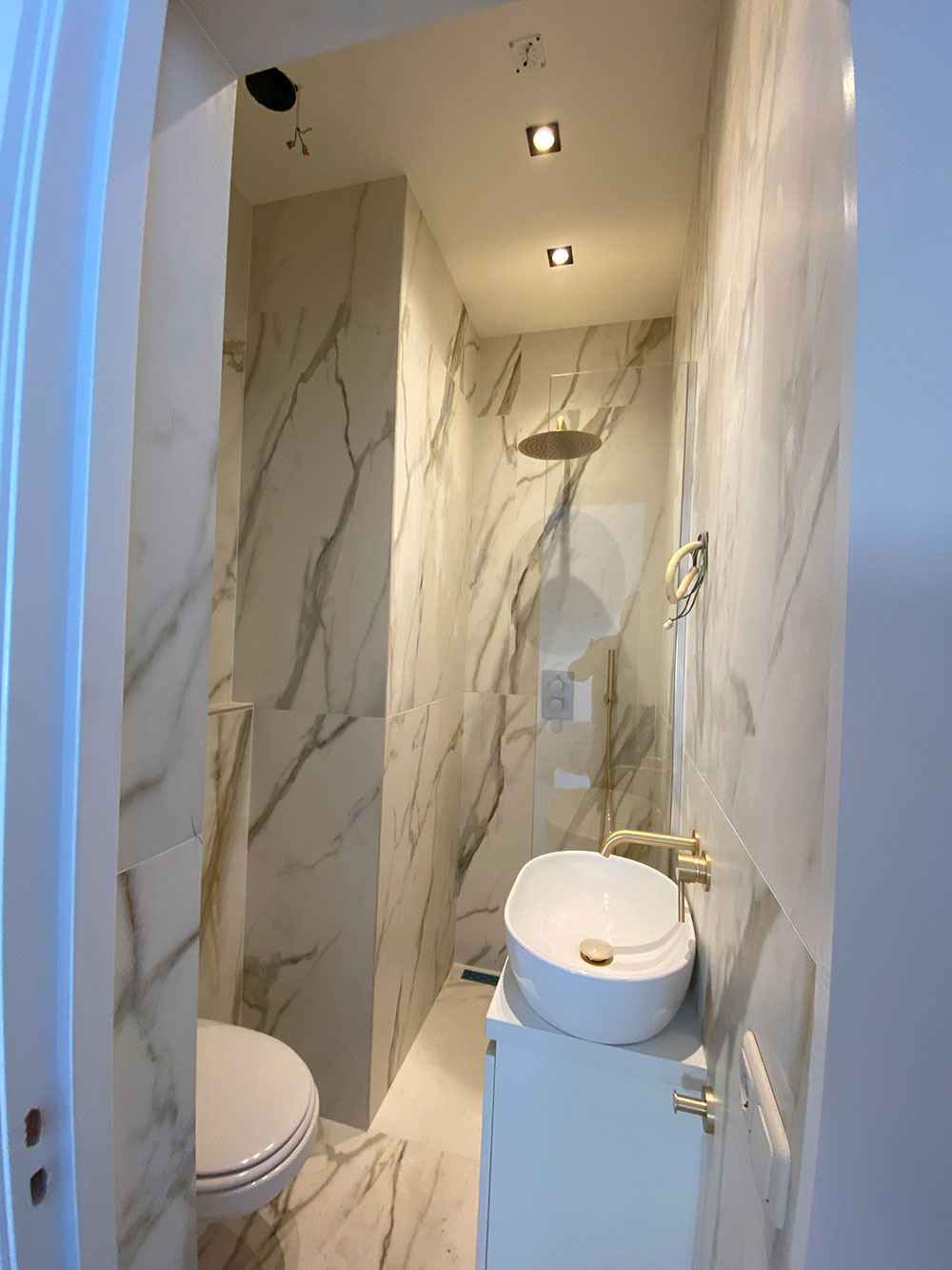 Vanuit de woonkamer is de deur naar de luxe uitgevoerde badkamer met douche en toilet. Ook hier de gouden kranen, een regendouche en met het prachtig marmer afgewerkt. Tevens is de badkamer voorzien van een infrarood spiegel. Dat verwarmt niet alleen je badkamer maar het is super gezond want het is beter voor vocht en huisstofmijt en tevens voorkomt het een beslagen spiegel na het douchen. De spiegel is bedienbaar met thermostaat.