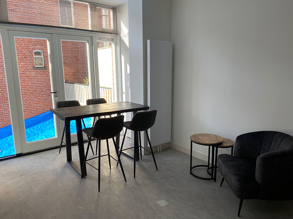 Links aan de achterzijde van de woonkamer is de deur naar de efficient ingerichte slaapkamer (met radiator) en een groot raam dat op de achterzijde is.