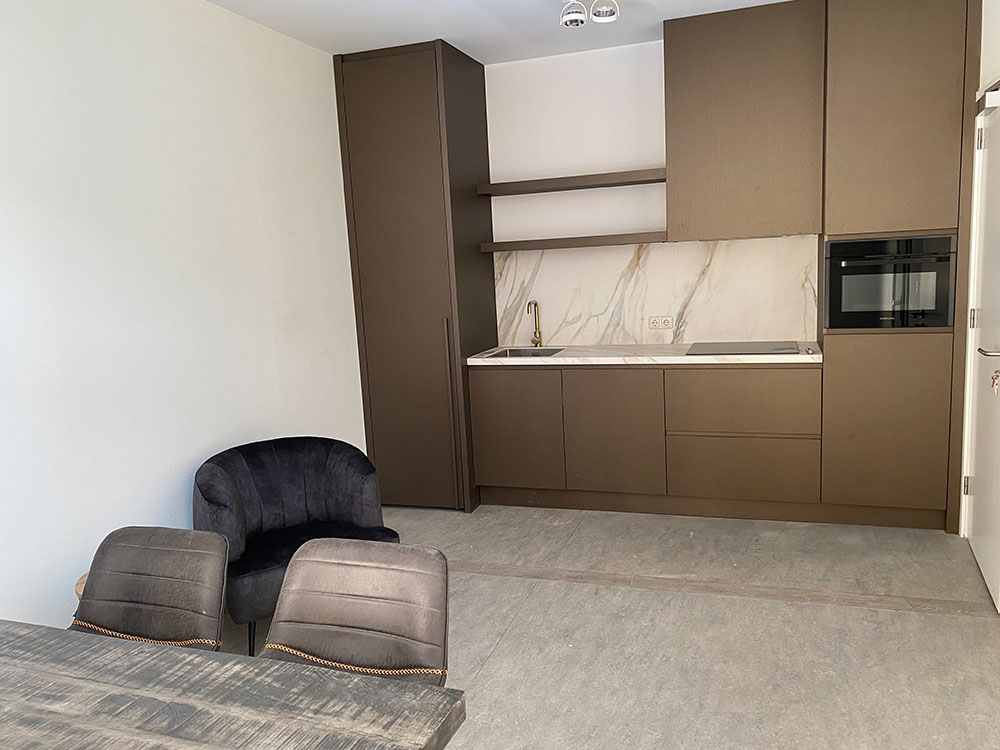 De prachtige luxe open keuken is voorzien van alle A klasse apparatuur ( elektrisch koken, vaatwasser, koel-/vriescombinatie, combi magnetron-oven) en veel kastruimte. Afgewerkt met echt marmer en voorzien van een gouden mengkraan.